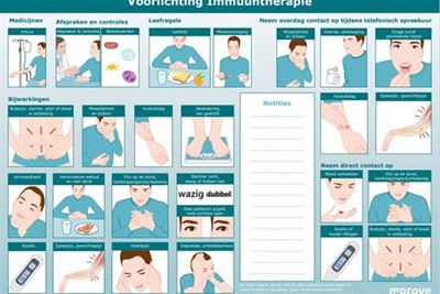 De praatplaat maakt de voorlichting over immuuntherapie aantrekkelijk en overzichtelijk. De illustraties voor de praatplaat zijn gemaakt door Maartje Kunen. Zij is gespecialiseerd in het maken van illustraties voor laaggeletterden. Maar de praatplaat is voor iedereen een prettig houvast, ook voor mensen die wel goed kunnen lezen. De praatplaat geeft verpleegkundig specialisten oncologie bovendien een houvast bij alle onderwerpen die besproken moeten worden en er kunnen ook notities op gemaakt worden. Patiënten krijgen de praatplaat mee naar huis, zodat zij deze steeds makkelijk kunnen raadplegen.
